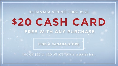 Get up to $20 Cash Card for free at Canadian American Eagle Outfitters stores with any purchase. Spend up to $50 and get $10 Cash Card. Or, spend $75 or more and get $20 Cash Card. Official source of the information is American Eagle Outfitters Canada. Offer expires 12/28/2015. More details about the promotion available at Canadian American Eagle Outfitters stores.