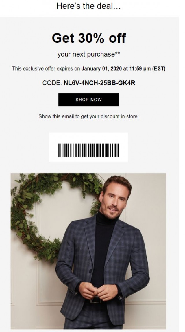 ** Offer valid in store and online at RW-CO.COM until January 01, 2020 (11:59PM ET). Receive 30% OFF on select regular-priced men’s and women’s merchandise, before applicable taxes. Name brands and the RW GO-TO’S are excluded from this offer. Cannot be used in conjunction with staff discount, gift card purchases or any other offer. Offer valid one time. Valid on new purchases only. REITMANS CANADA LIMITED reserves the right to modify or terminate this offer without prior notice.