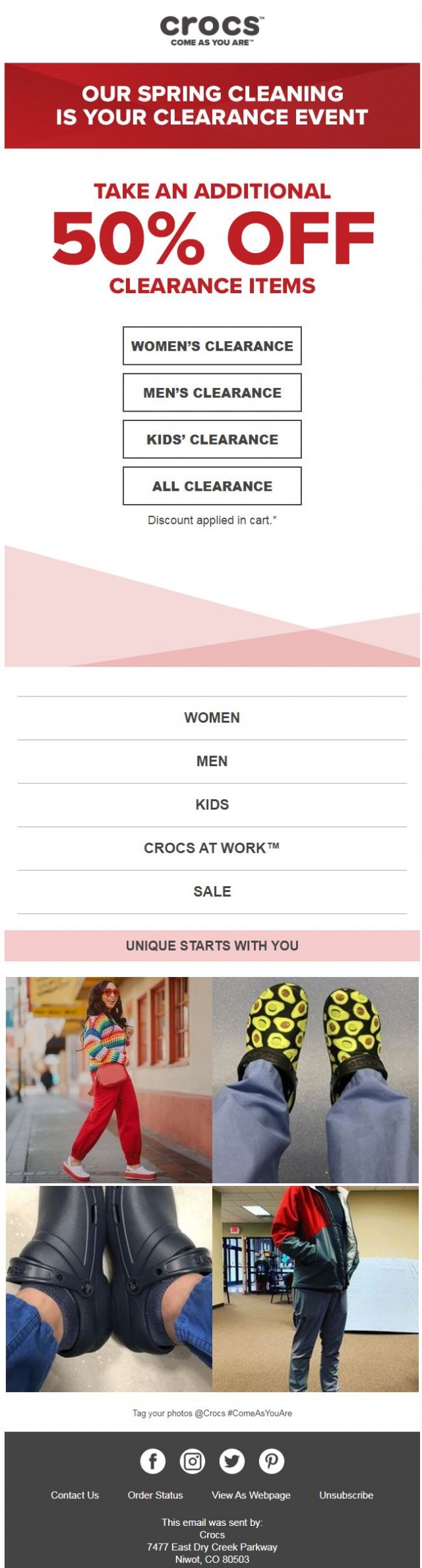 Give us your experience with Crocs Canada - Spring cleaning: extra 50% off clearance styles starts now, write a short review.