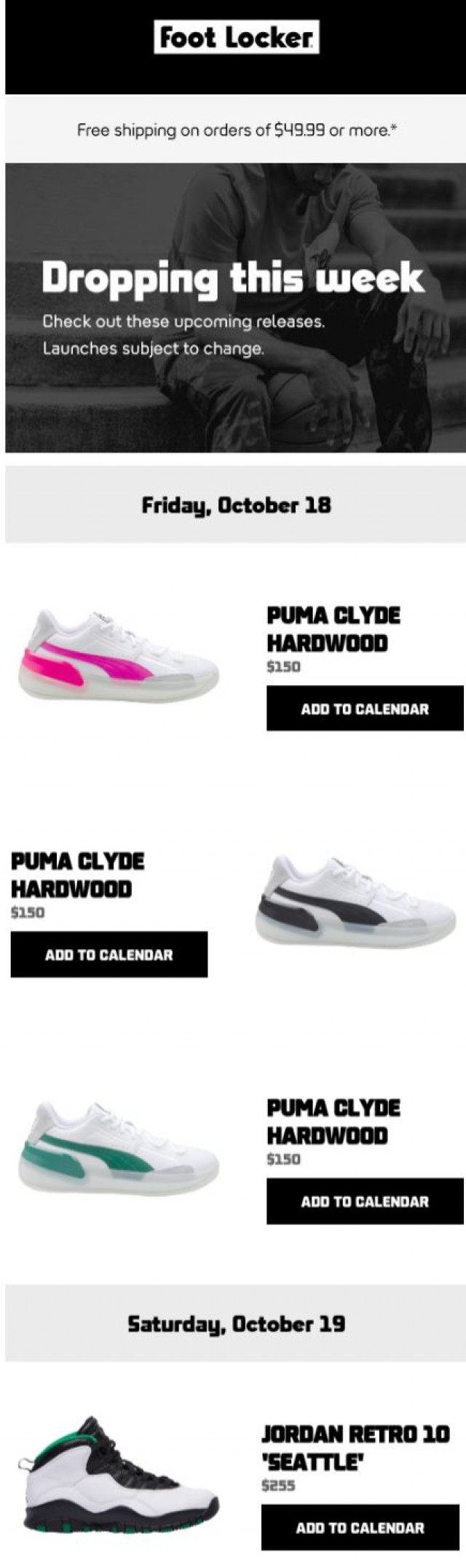 *Order value must total $49.99 or more before services, taxes, shipping and handling. Savings are automatically applied at checkout. Valid only for eligible merchandise purchased at footlocker.ca. Offer does not apply to in-store orders. Offer is limited to standard delivery within Canada.