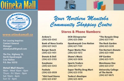 Otineka Mall offers more than 17 brand name stores. Otineka Mall is located in Opaskwayak, Manitoba - Hwy 10 N, Opaskwayak, MB R0B 2J0 (GPS: 53.834045, -101.261706).