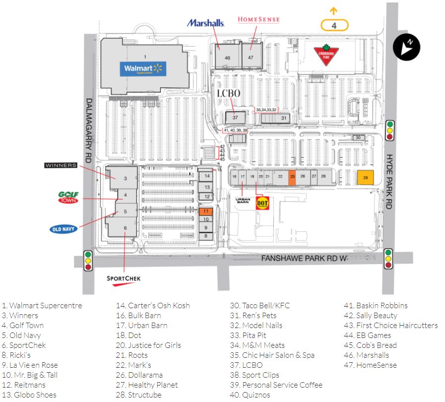The shopping center is located not far away from the center of London., on the corner of Fanshawe Park Road West and Stanton Dr.