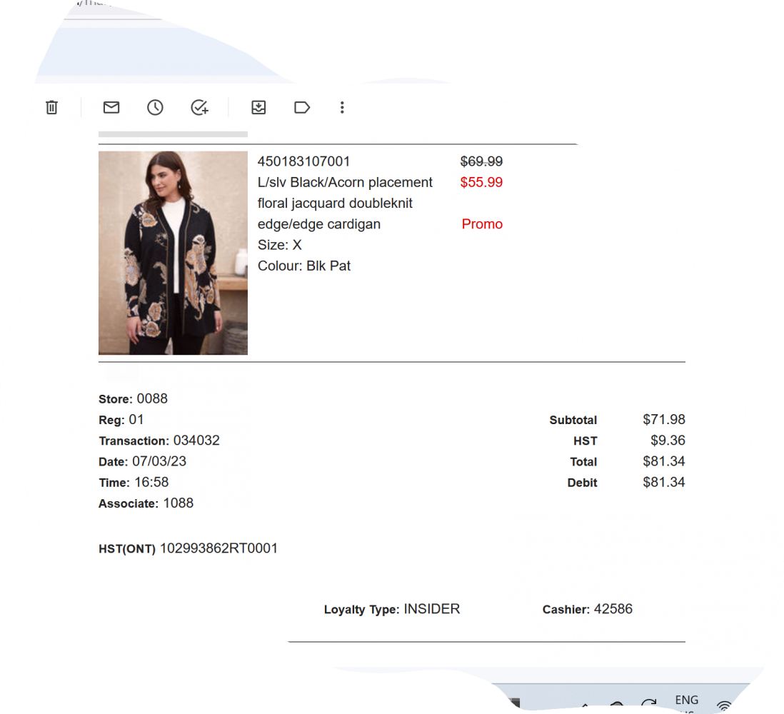 I was very dissatisfied with the service at the front desk, I paid for my items part in cash and part by debit card, the clerk that serve me ask me for my e-mail and did not explain to me that the receipt of the bill will be shown in my e-mail so I ask for the receipt and she refused to give it me , repeating that is in my e-mail , I got a little upset and told her that I 'am not walking out of the store without a receipt than she said I can only give you a copy I said Ok she give me the copy but the copy did not show the amount that I paid in cash , and I request form her the copy of the proper bill, again she refused to give it to me and I ask her to write on the copy that I give her cash and to sign her name, she refused to give me her name and would not sign the receipt. She also said that to retrieve the e-mail would take her about 10 min. time and told me that when i get home I would find the bill in my e-mail . Unfortunate when I checked my e-mail nothing was there no e-mail form Laura's store at Dixie Mall.